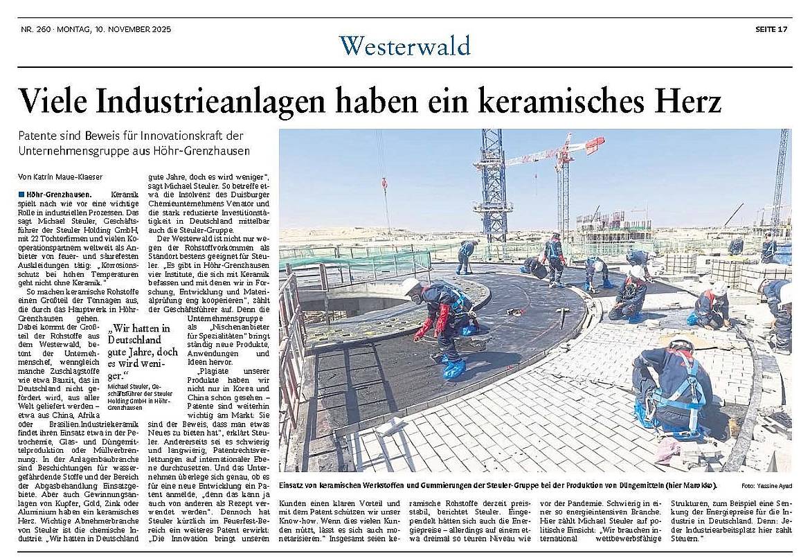 In ihrer Ausgabe vom 10. November 2025 spricht die Westerwälder Zeitung mit Michael Steuler (Geschäftsführer der Steuler-Gruppe, Höhr-Grenzhausen) über keramische Produkte in industriellen Prozessen und die Rolle von Innovationen und Patenten für die Geschäftstätigkeit der Steuler-Gruppe.